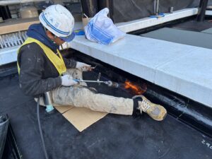 「トーチ工法」は一言でいうと、専用の「トーチバーナー」を使って改質アスファルトルーフィングという防水シートの裏面をあぶり、下地に溶着させて貼り付ける工法のことです。
